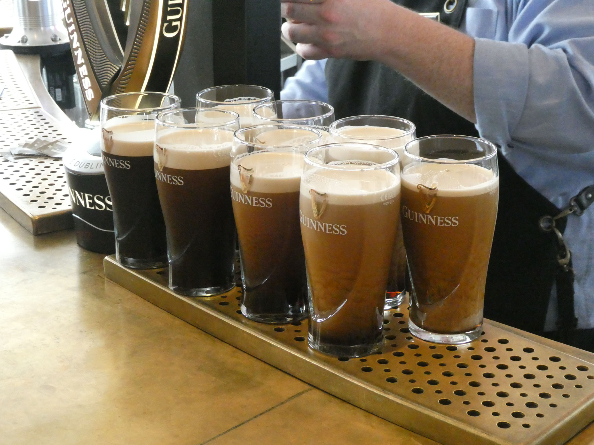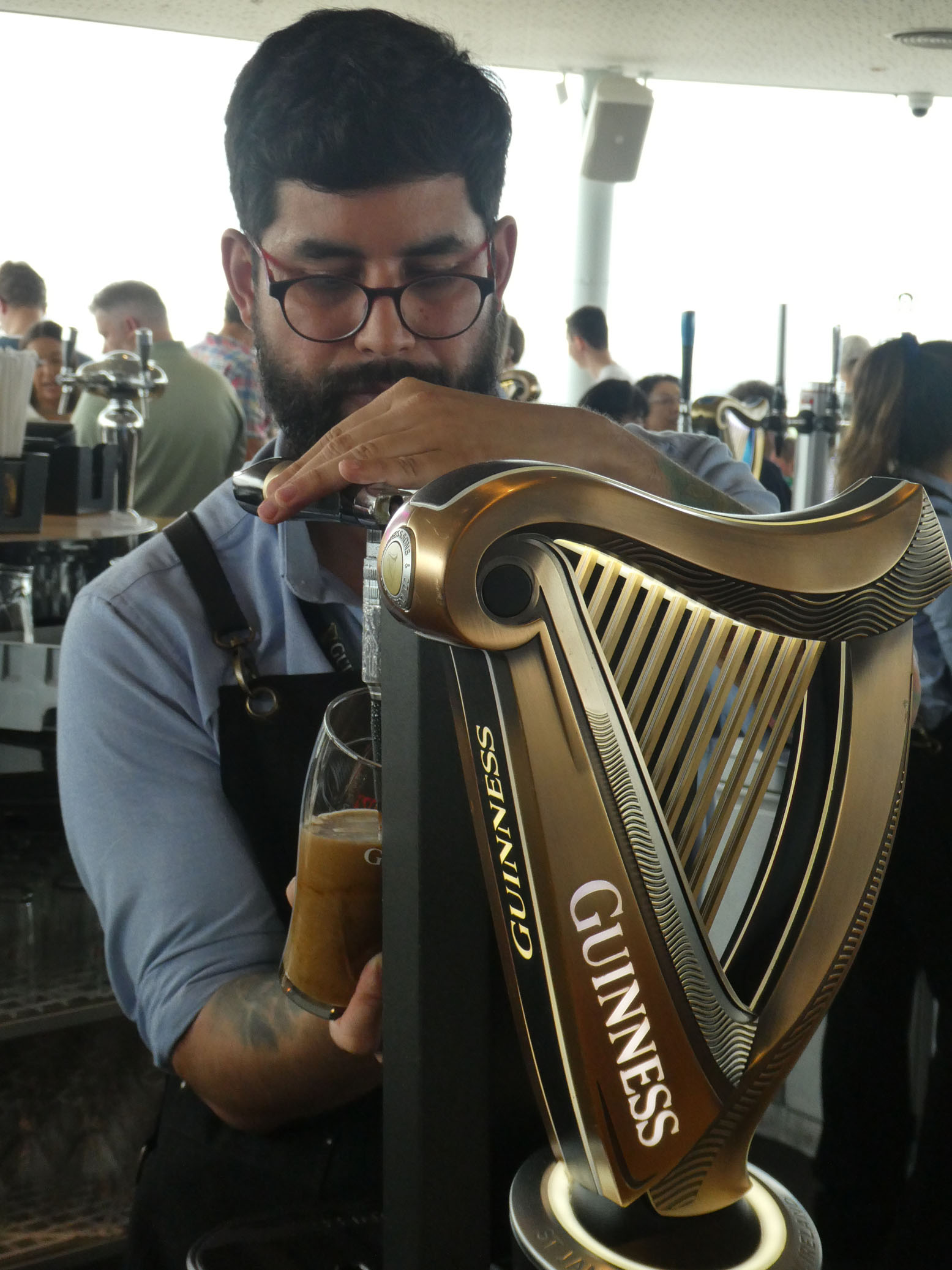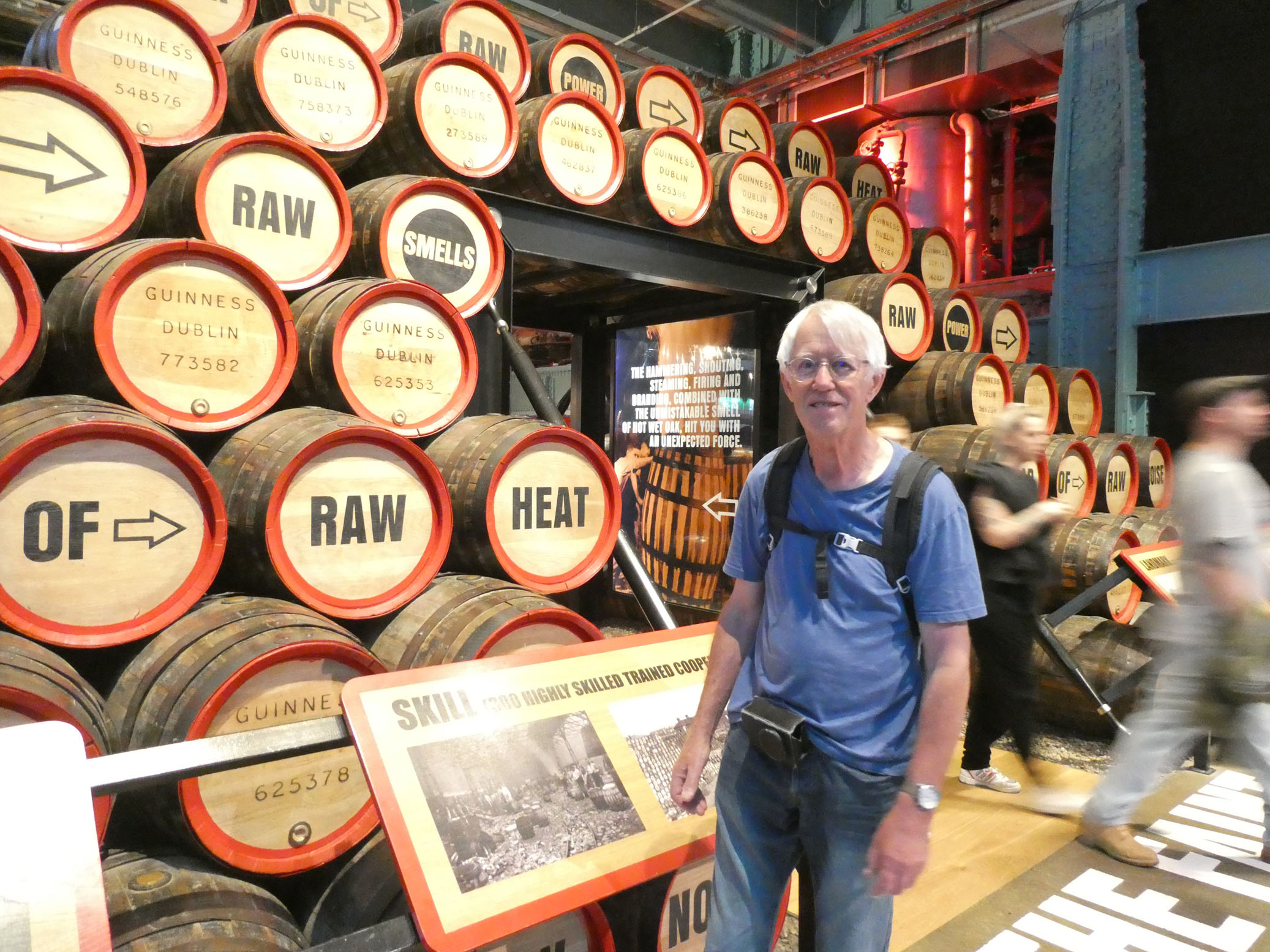 Puis direction la Guinness Storehouse Experience. Vous vous en doutez, il s’agit d’une exposition à la gloire de la célèbre marque de bière. Le prix du billet comprend la dégustation d’une pinte de bière, que nous avons bien appréciée (Marie-Christine a pris un soda !).