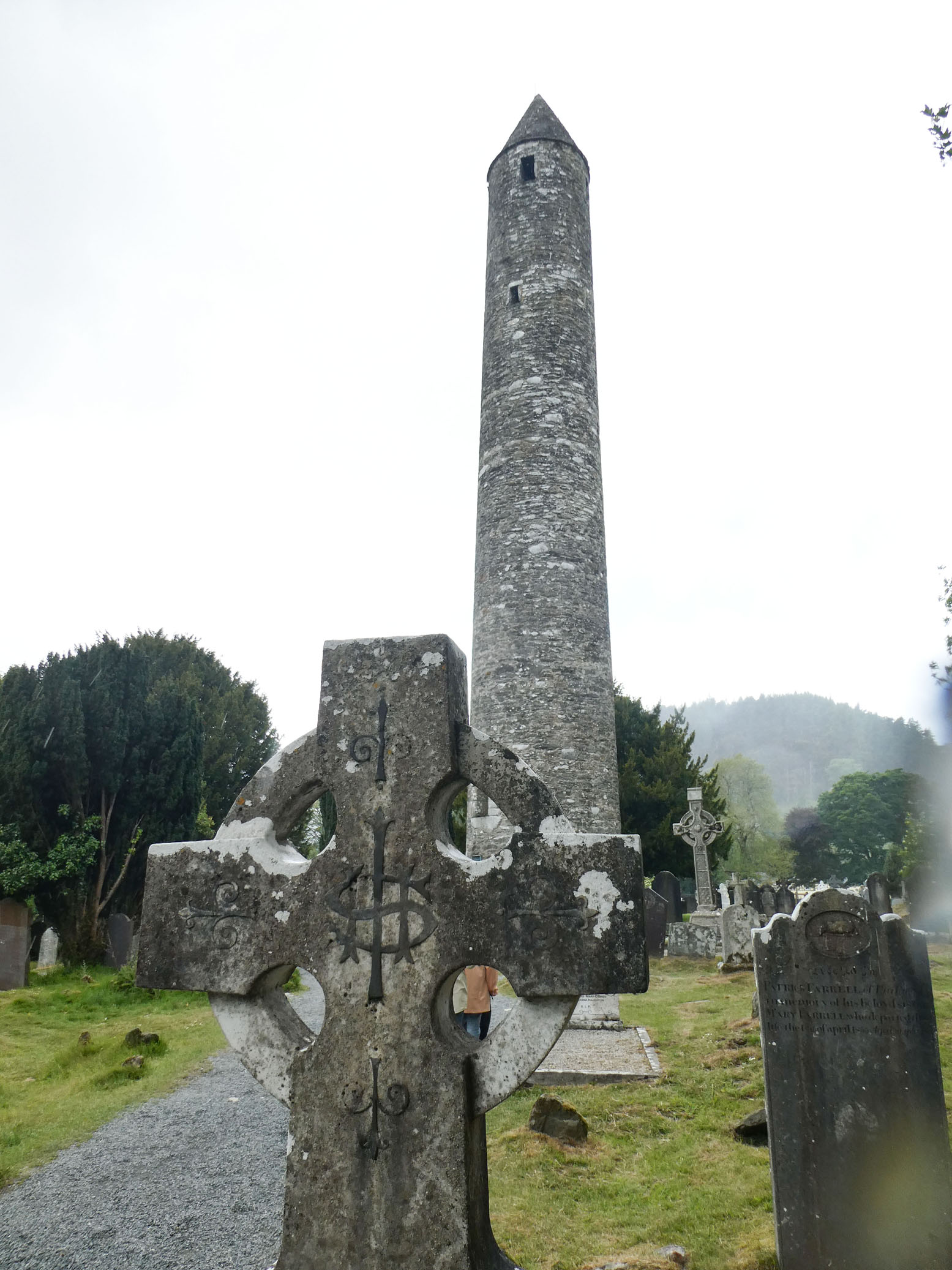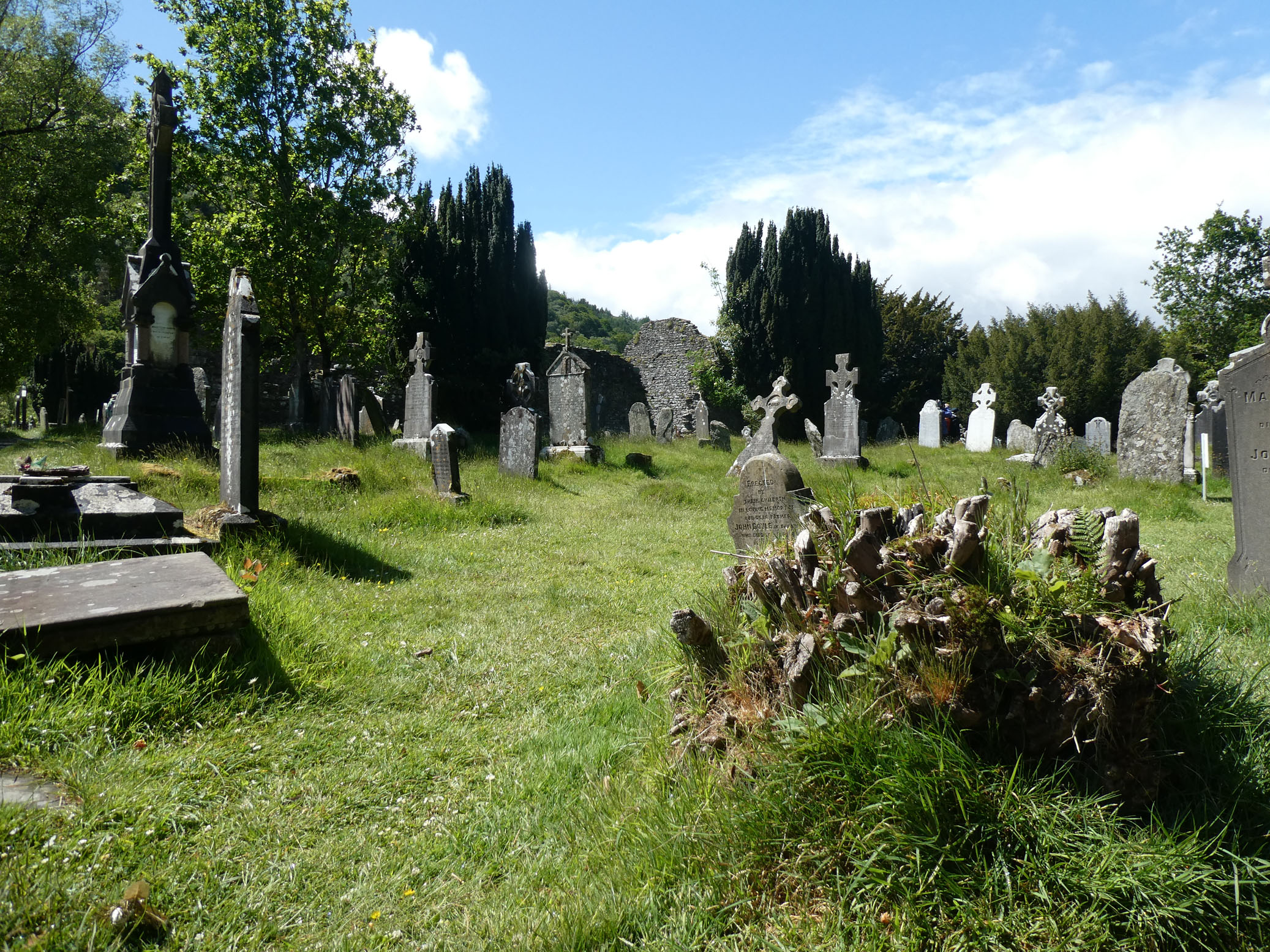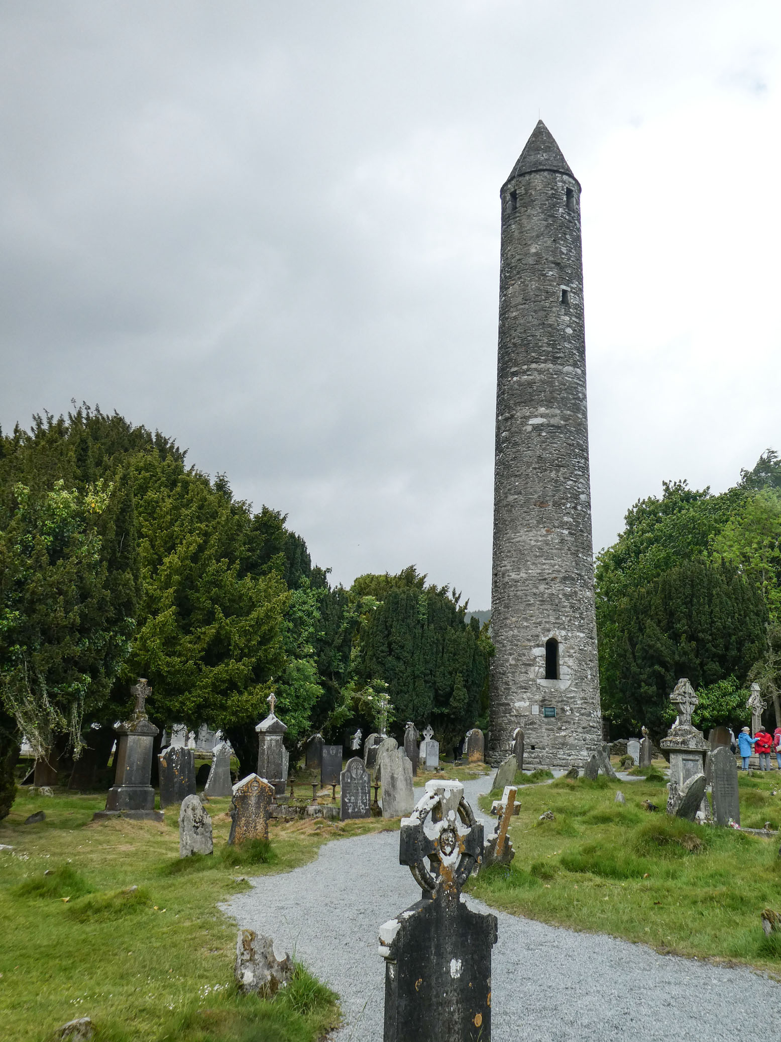 Puis direction Glendalough. C’est le site d’une cité monastique créée au VIe siècle par l’ermite St Kevin au bord d’un lac. Il en subsiste une tour ronde, tour-clocher de 30 mètres qui pouvait servir de refuge à la communauté en cas d’attaque. Également les ruines de la cathédrale, une petite église et un cimetière.