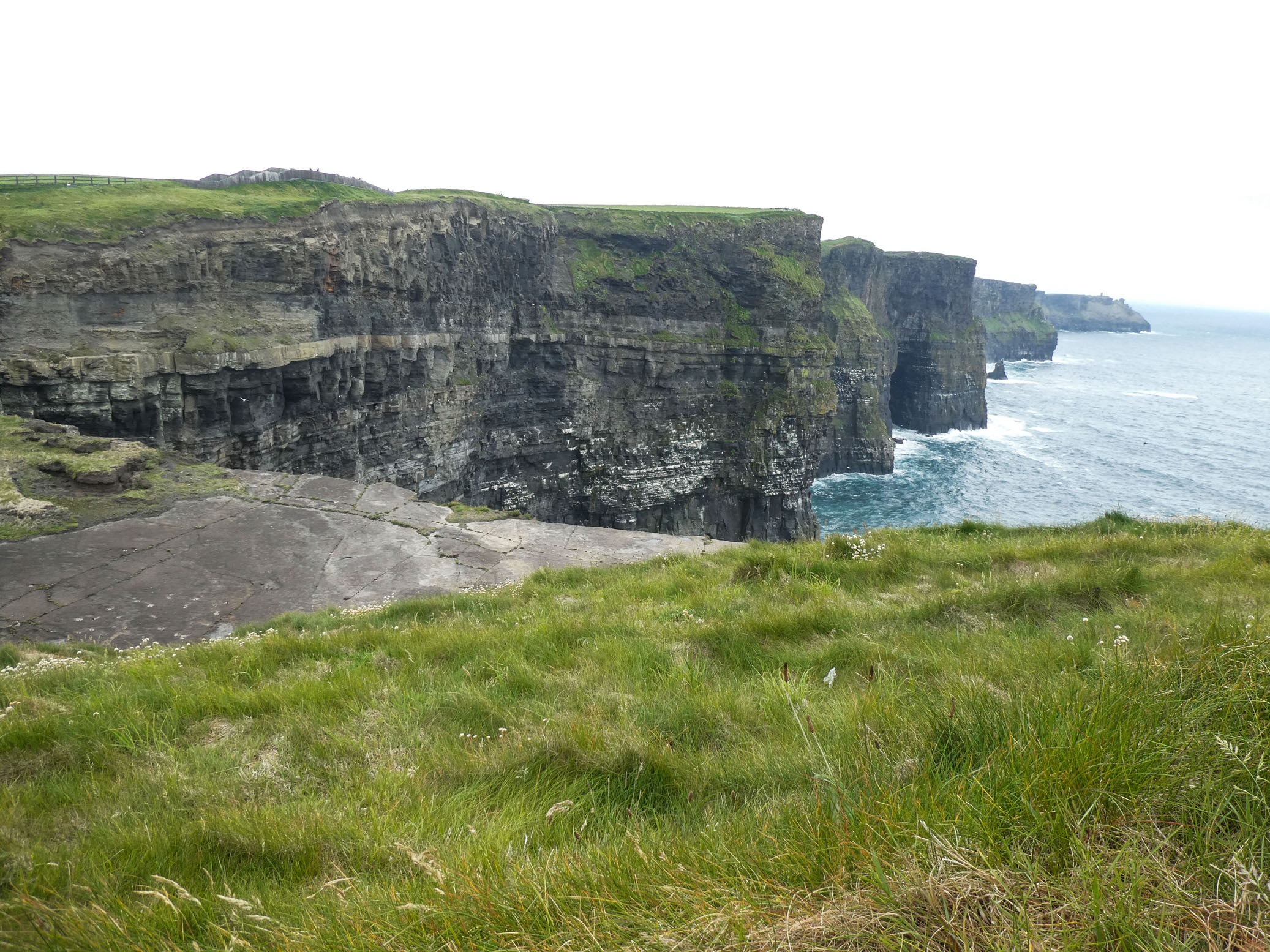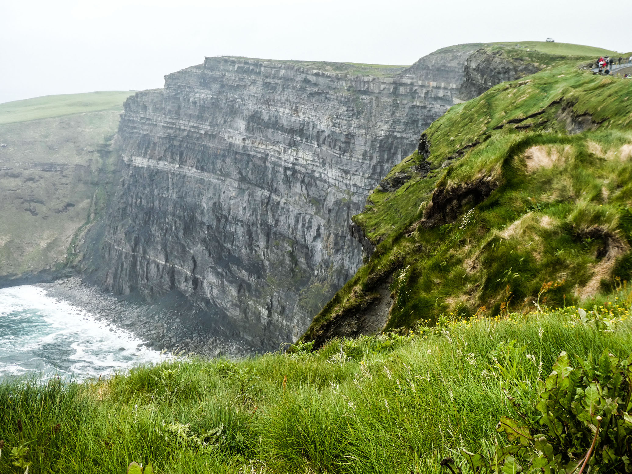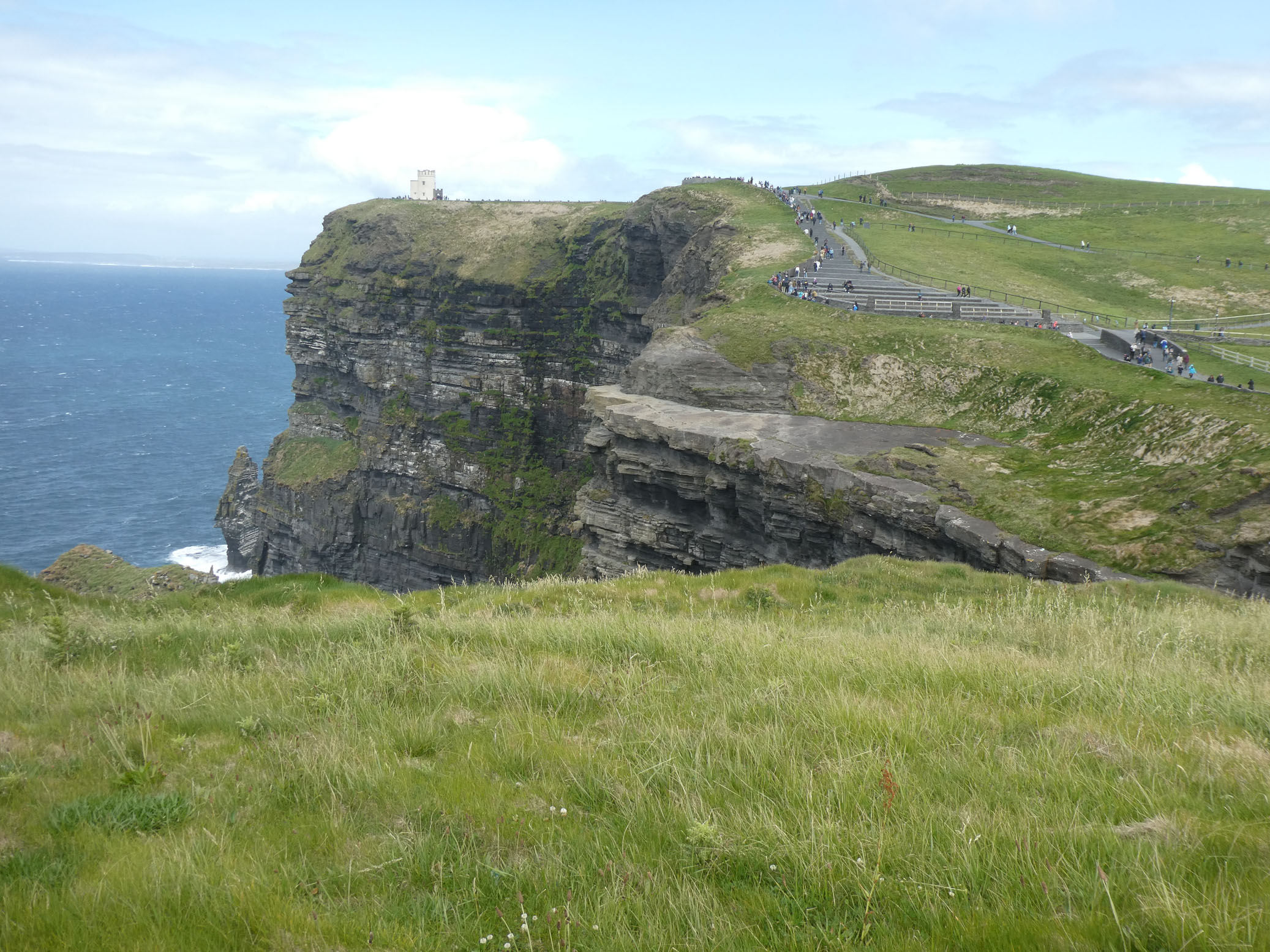 Les falaises de Moher sont un des lieux les plus visités d’Irlande. On n’était donc pas tout seuls. Le temps nous a été (relativement) clément avec des passages nuageux, un peu de brume, mais de belles éclaircies. On a donc bien vu les falaises, en s’accrochant bien à cause du vent. Heureusement tout est hyper-sécurisé. Très beaux panoramas qui compensent largement le Visitor Center un peu léger.
