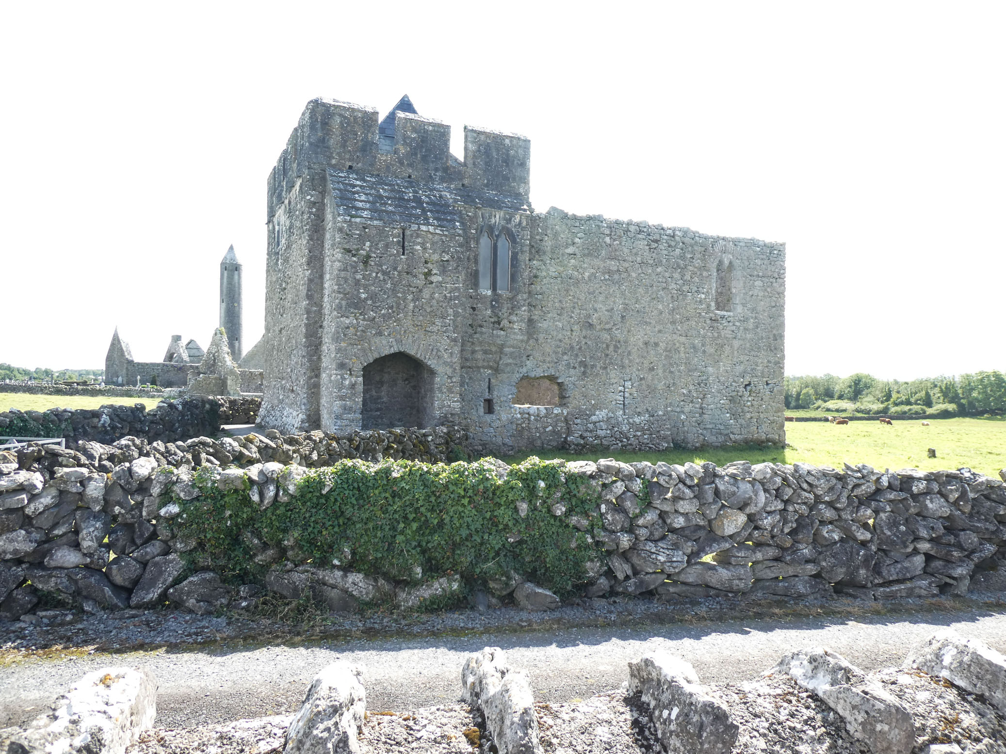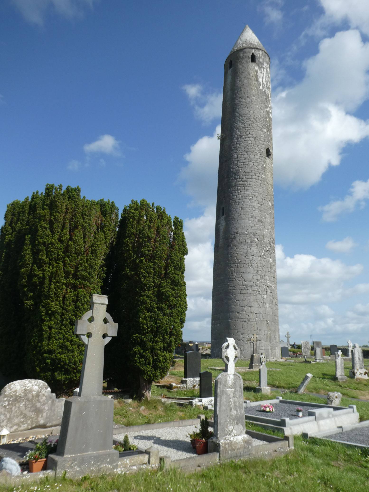 En route vers Galway, on tombe par hasard sur le monastère en ruine de Kilmacduagh (fondé au VIIe siècle) qui est un vrai bon plan. Sa tour ronde (XIe siècle) est remarquablement conservée et mesure 34 mètres.. La porte d’entrée est à 8 mètres du sol, ce qui protégeait les moines un temps en cas d’attaque.