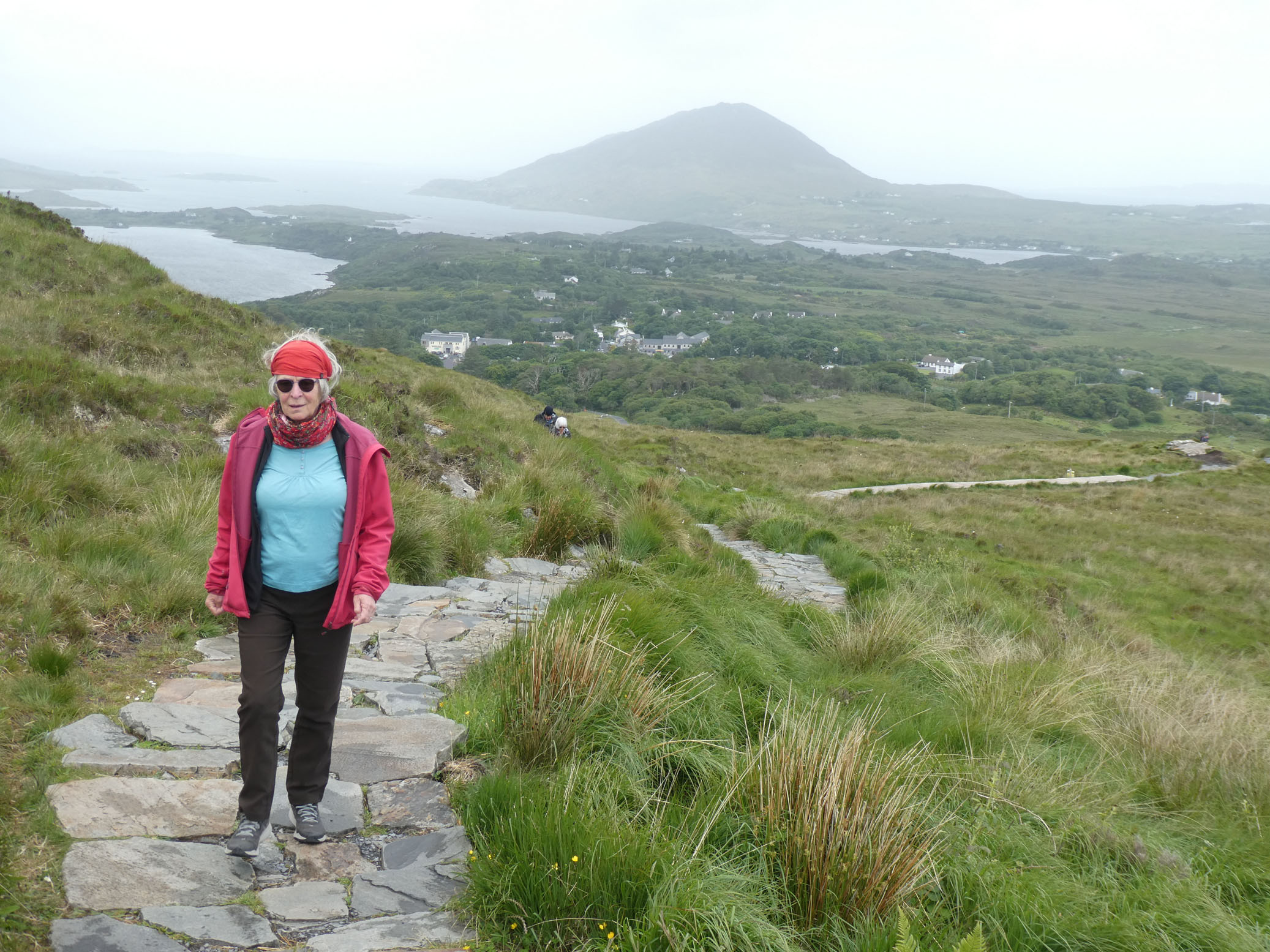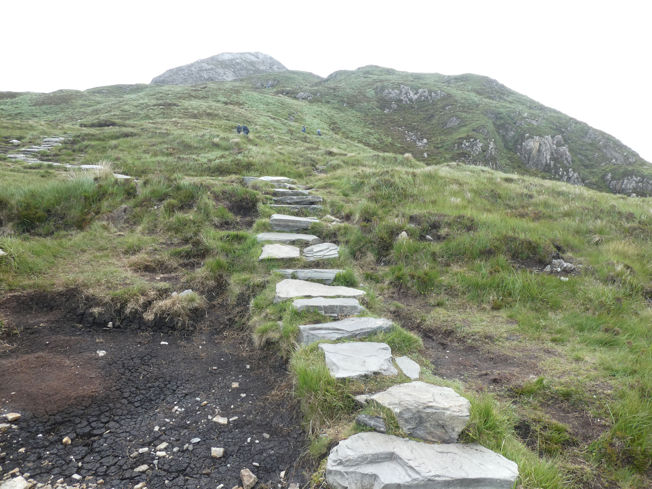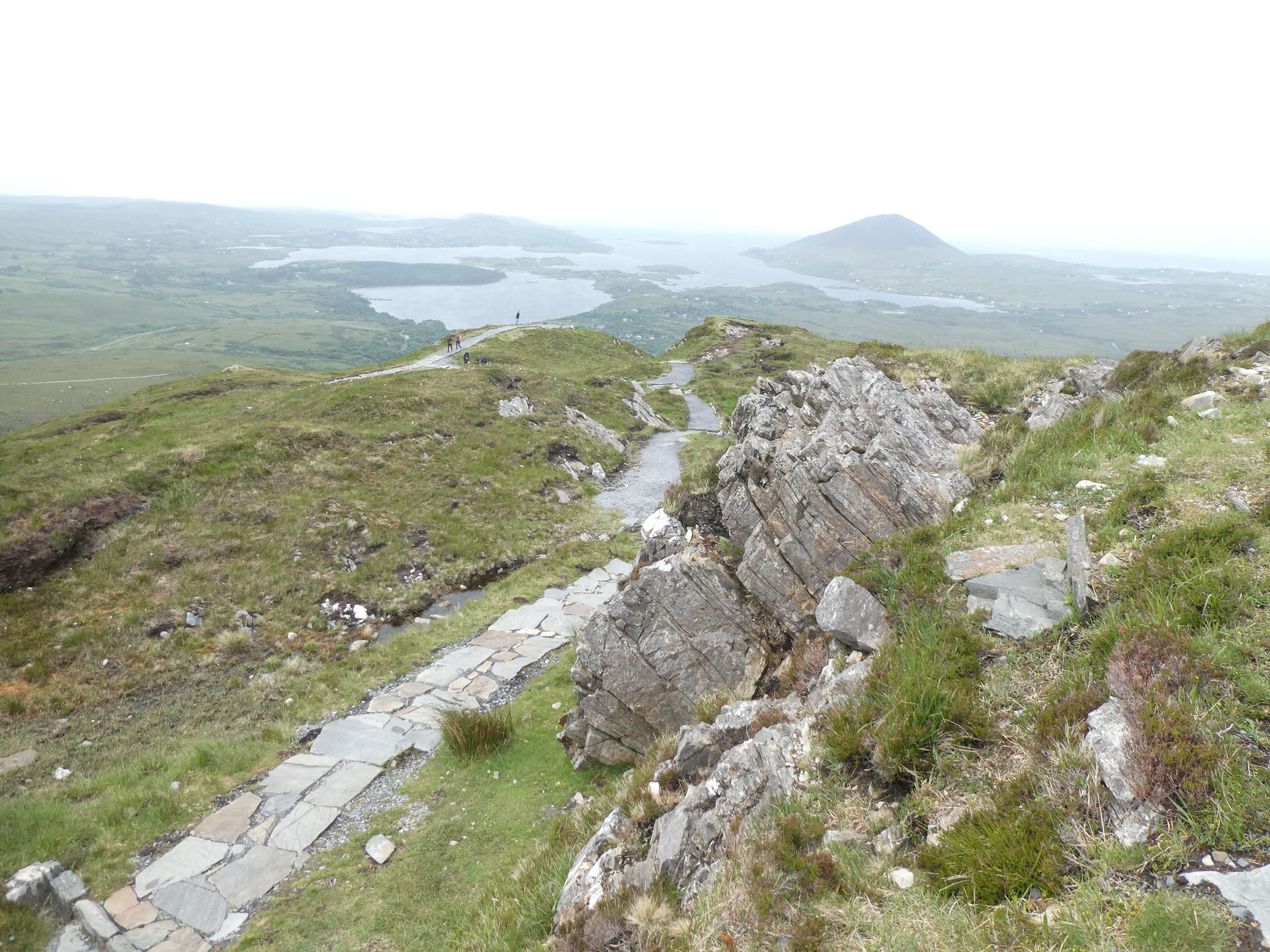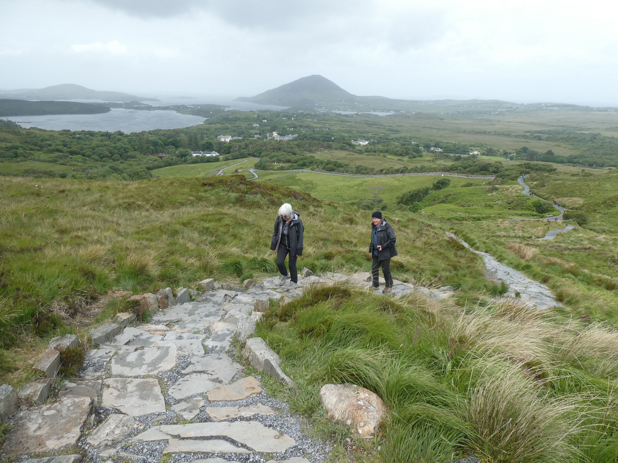 Le temps est changeant. Est-ce bien raisonnable d’envisager une randonnée dans le parc national du Connemara ? Nous avons décidé que oui et nous ne l’avons pas regretté. Quelques épisodes pluvieux, mais rien de problématique. Le Upper Diamond Hill Walk fait presque 7 kilométres pour 400 mètres de dénivelé. Ça grimpe bien sur certains passages. Là aussi, des paysages à couper le souffle, comme dit le Routard.