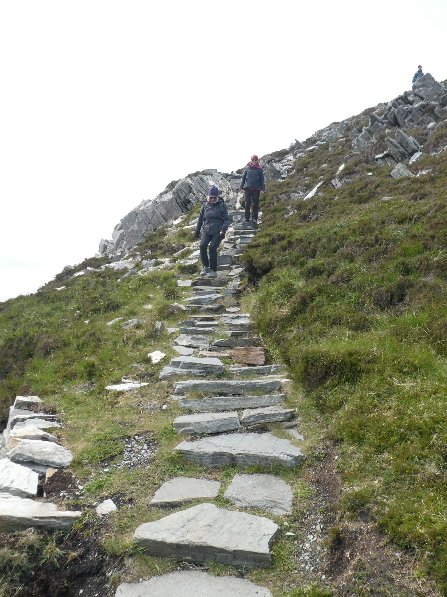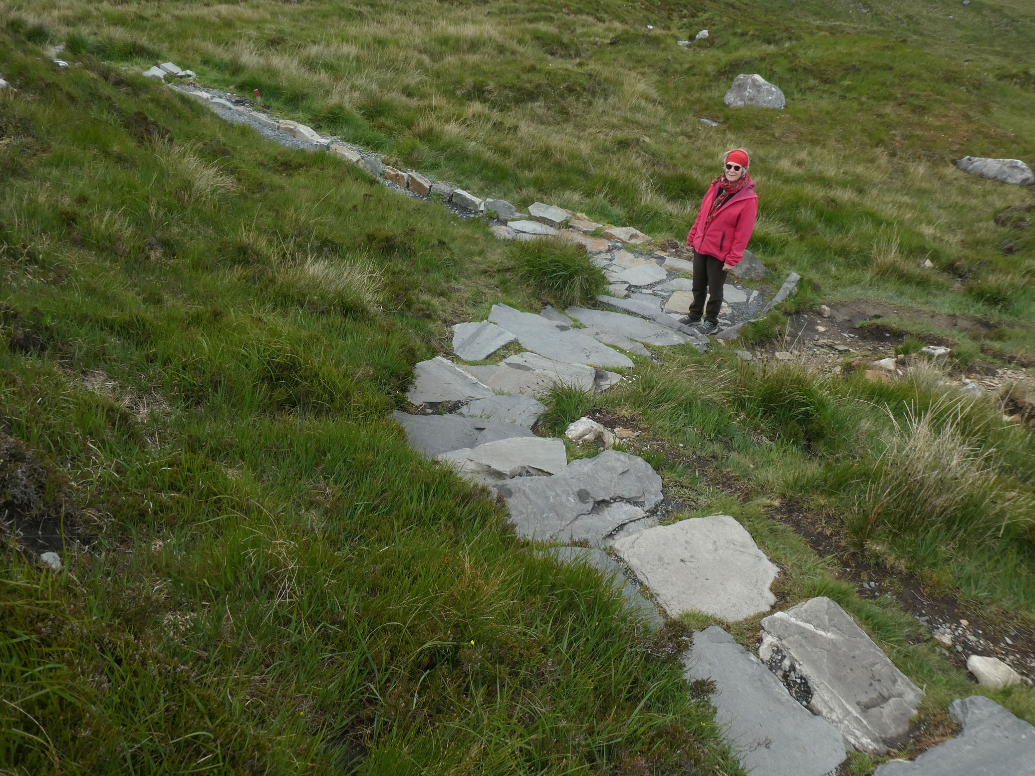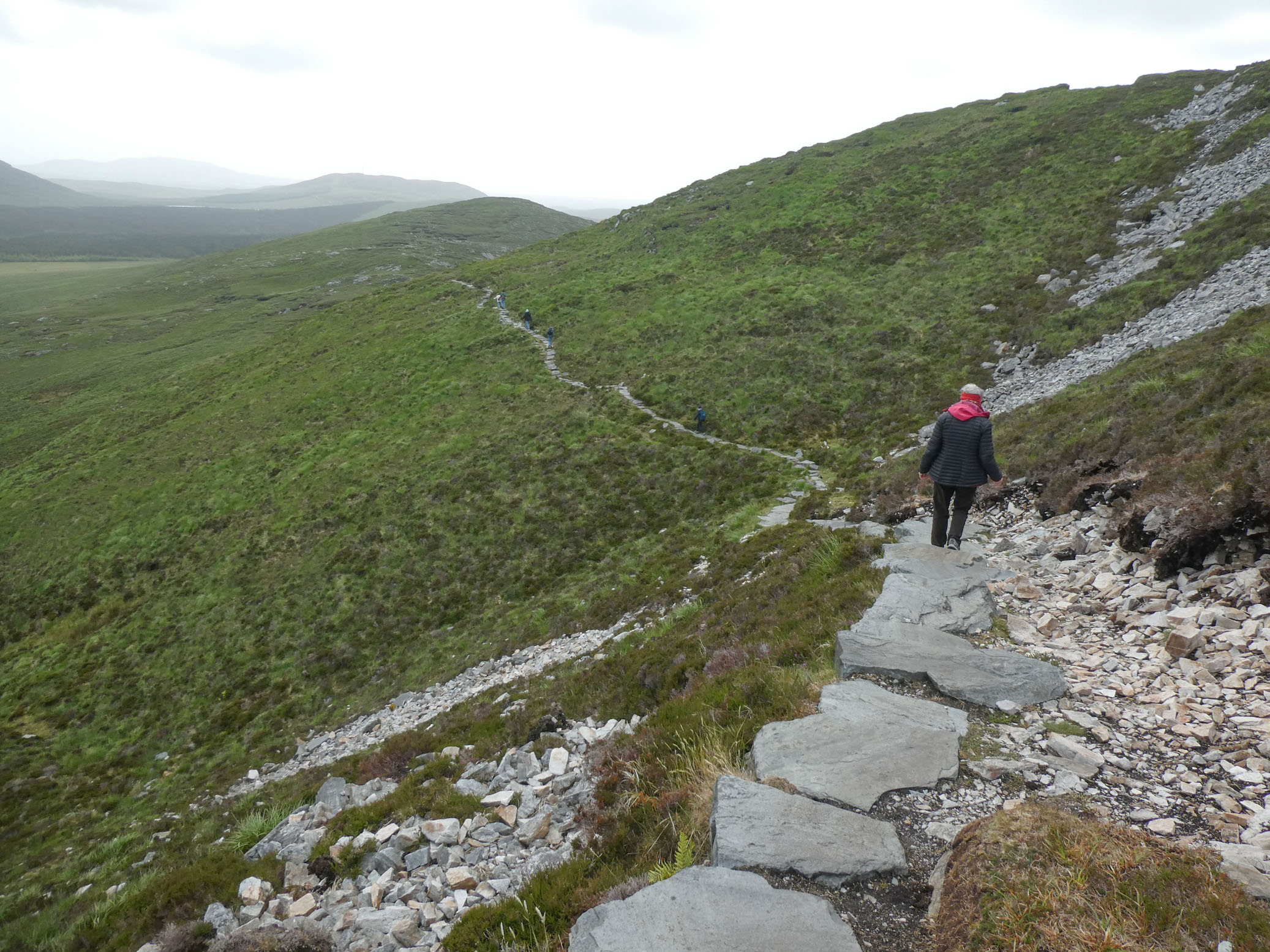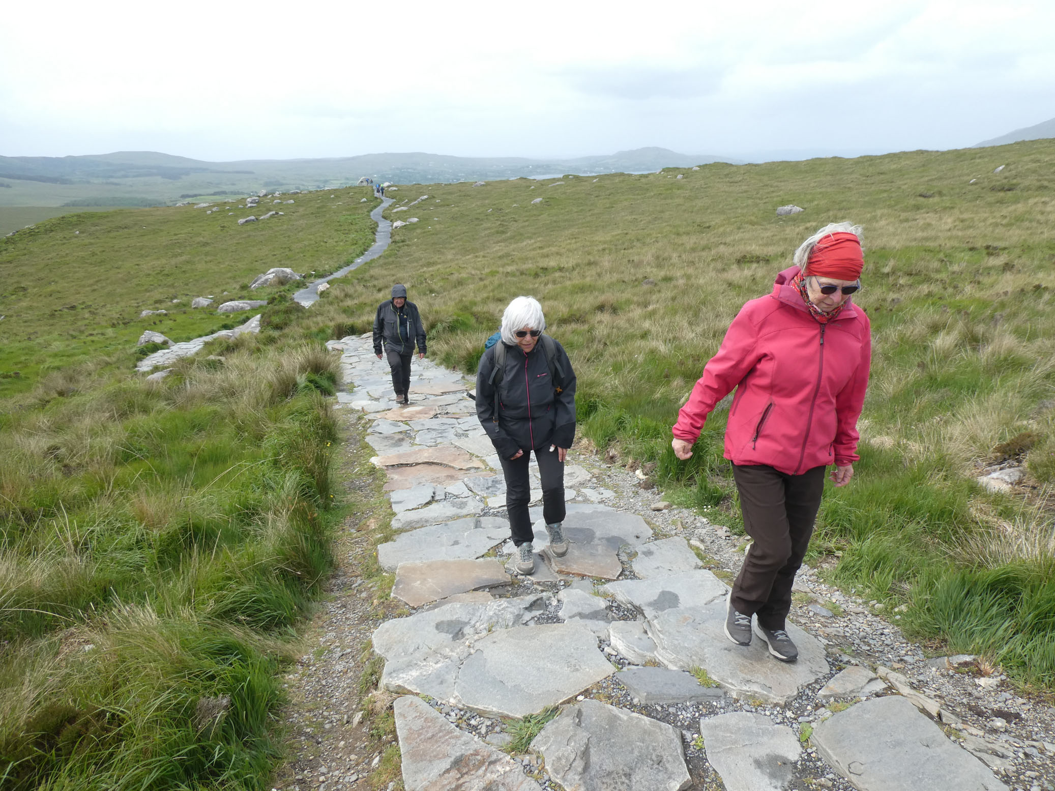 Le temps est changeant. Est-ce bien raisonnable d’envisager une randonnée dans le parc national du Connemara ? Nous avons décidé que oui et nous ne l’avons pas regretté. Quelques épisodes pluvieux, mais rien de problématique. Le Upper Diamond Hill Walk fait presque 7 kilométres pour 400 mètres de dénivelé. Ça grimpe bien sur certains passages. Là aussi, des paysages à couper le souffle, comme dit le Routard.
