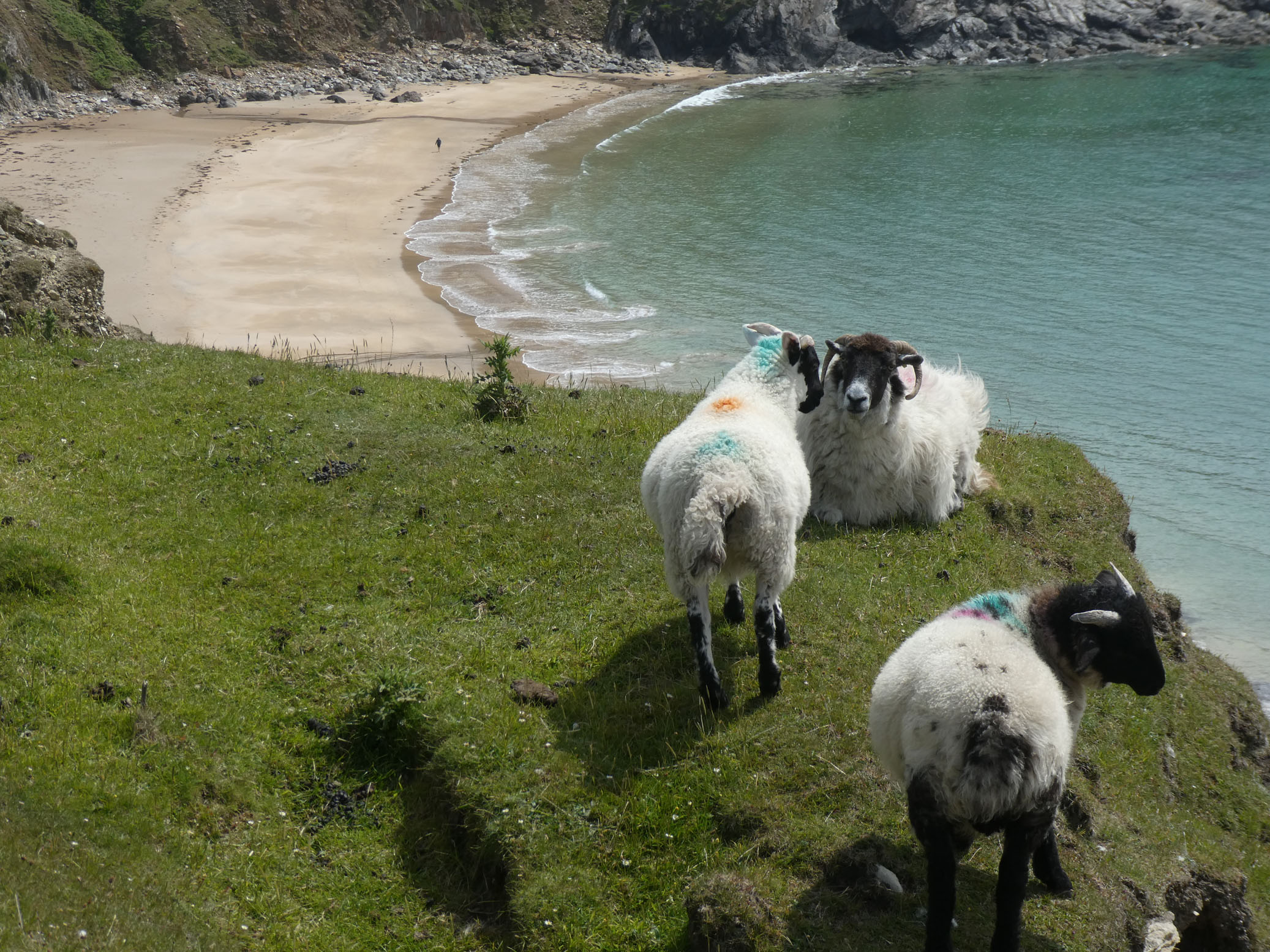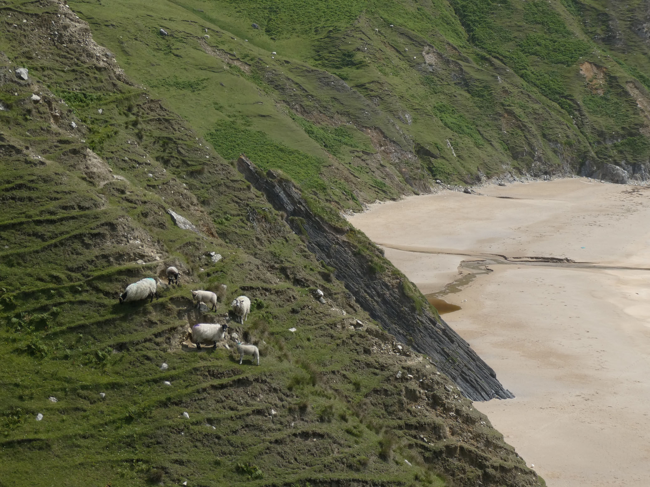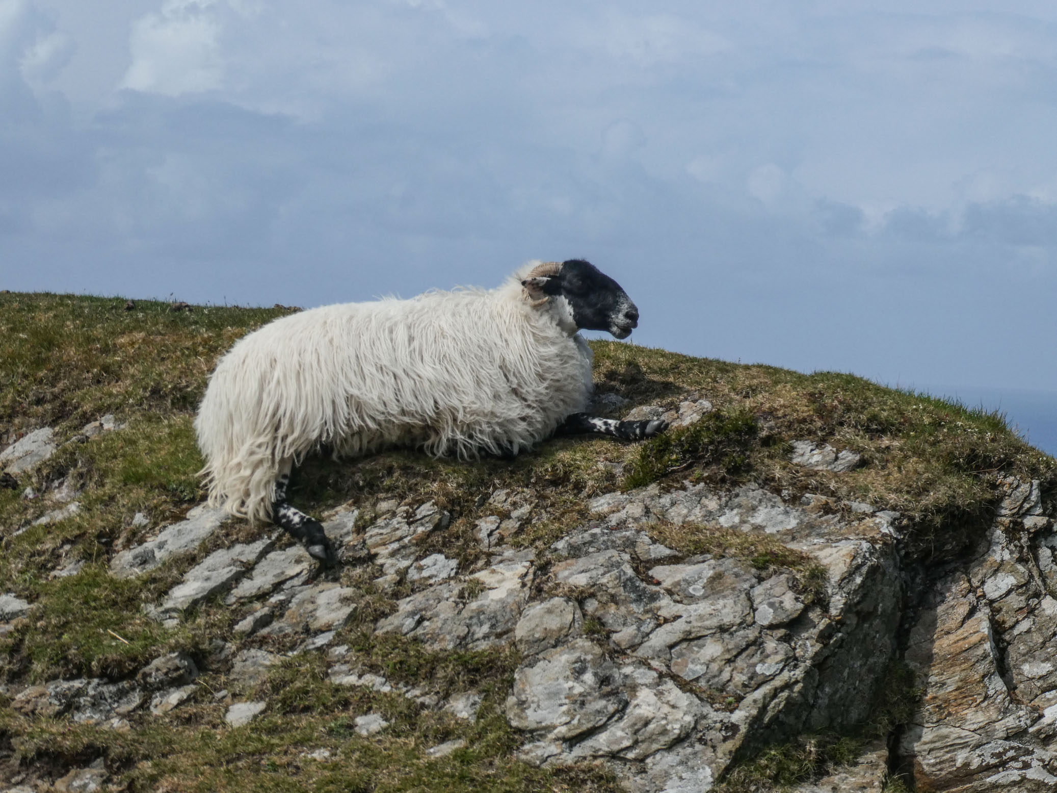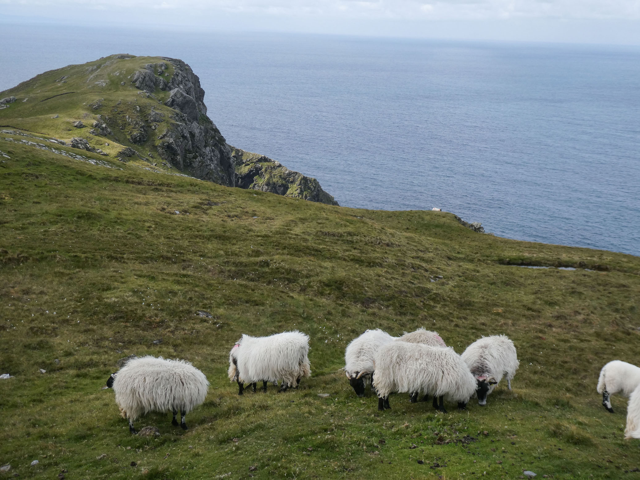 On commence la journée par les falaises de Slieve League, qui comptent parmi les plus hautes d’Europe. Quelques kilomètres de marche pour se mettre en train. Quelques gouttes de pluie pour nous rafraichir, s’il en était besoin. Quelques magnifiques vues et quelques moutons.