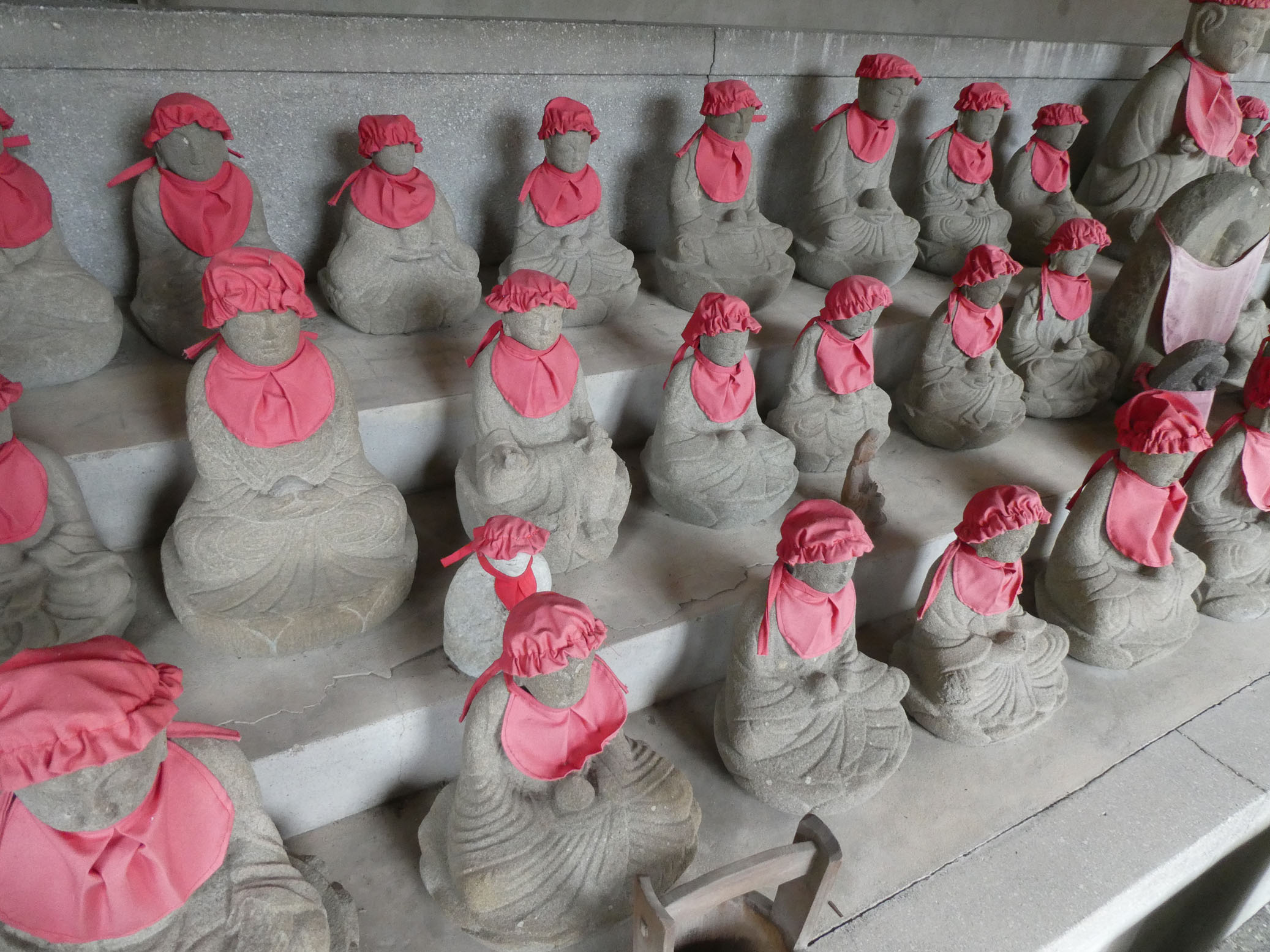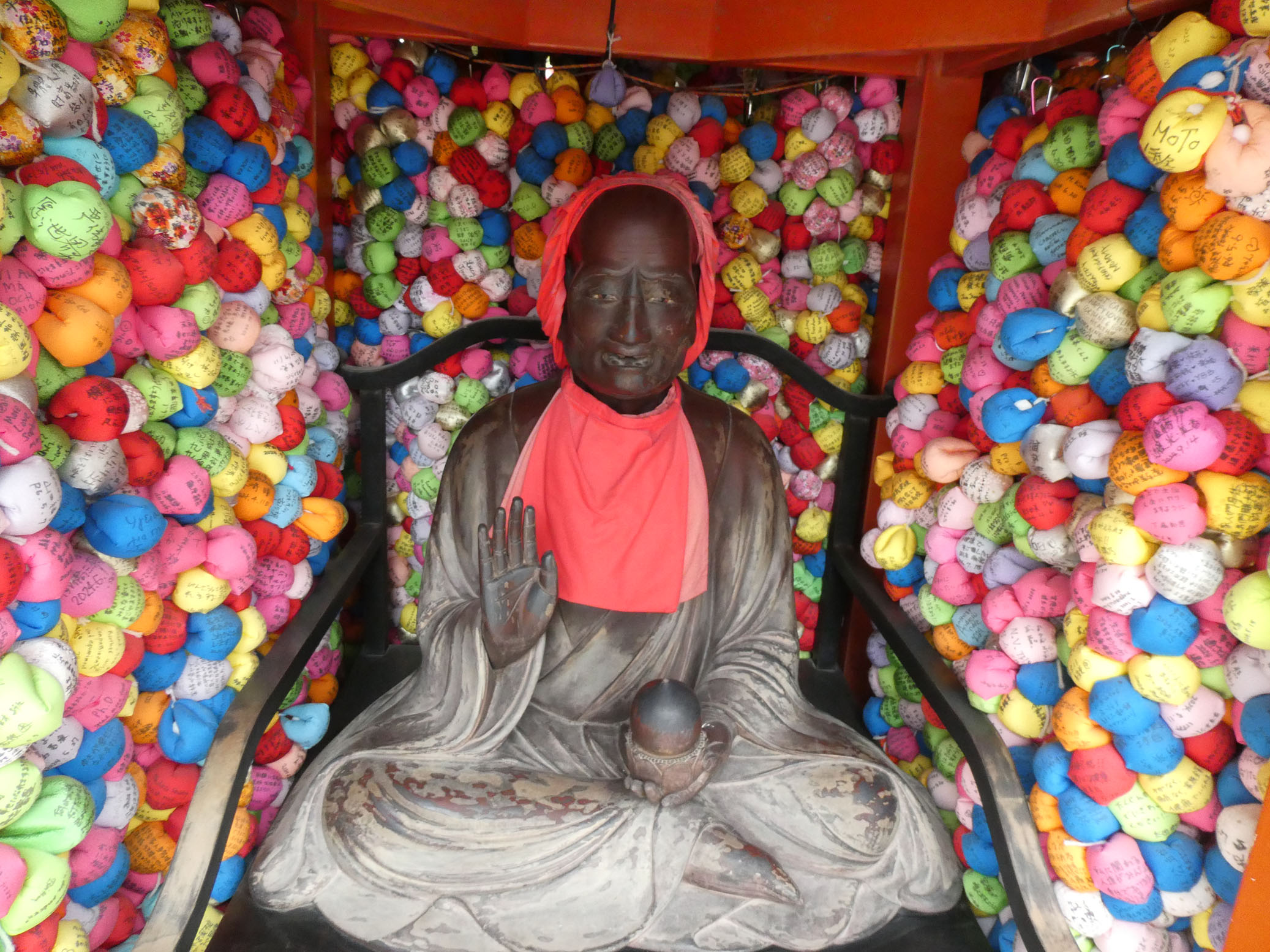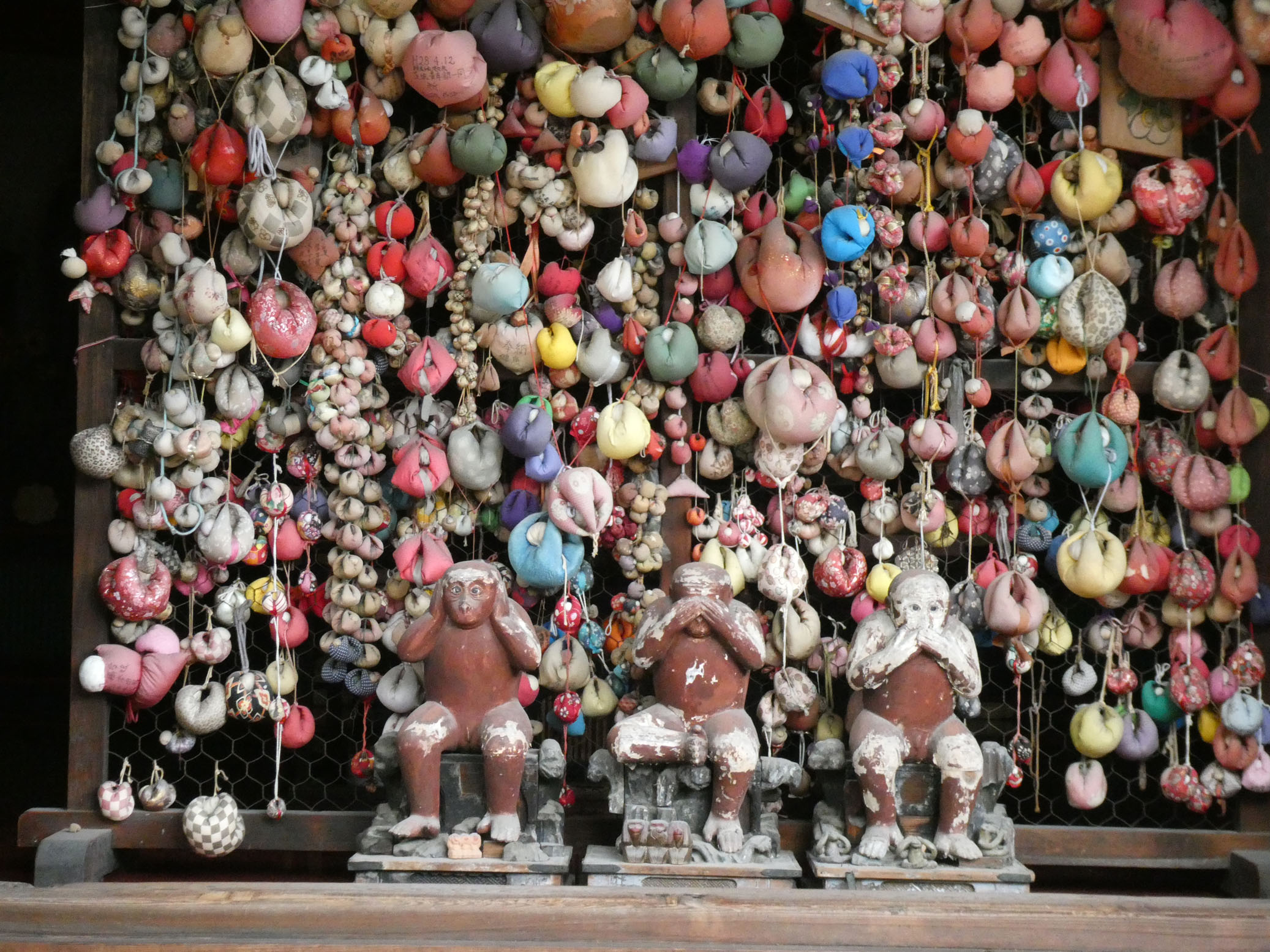 Un petit temple où les traditionnelles plaquettes de bois où on inscrit ses voeux sont remplacés par des sortes de boules en tissu.