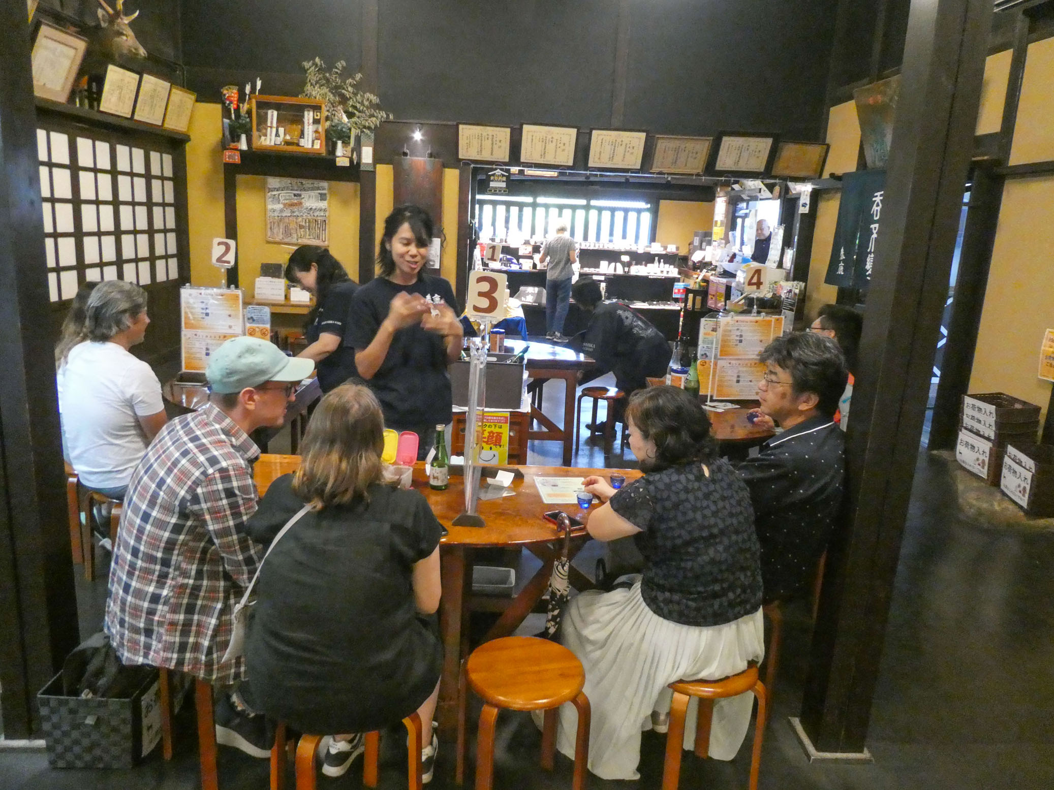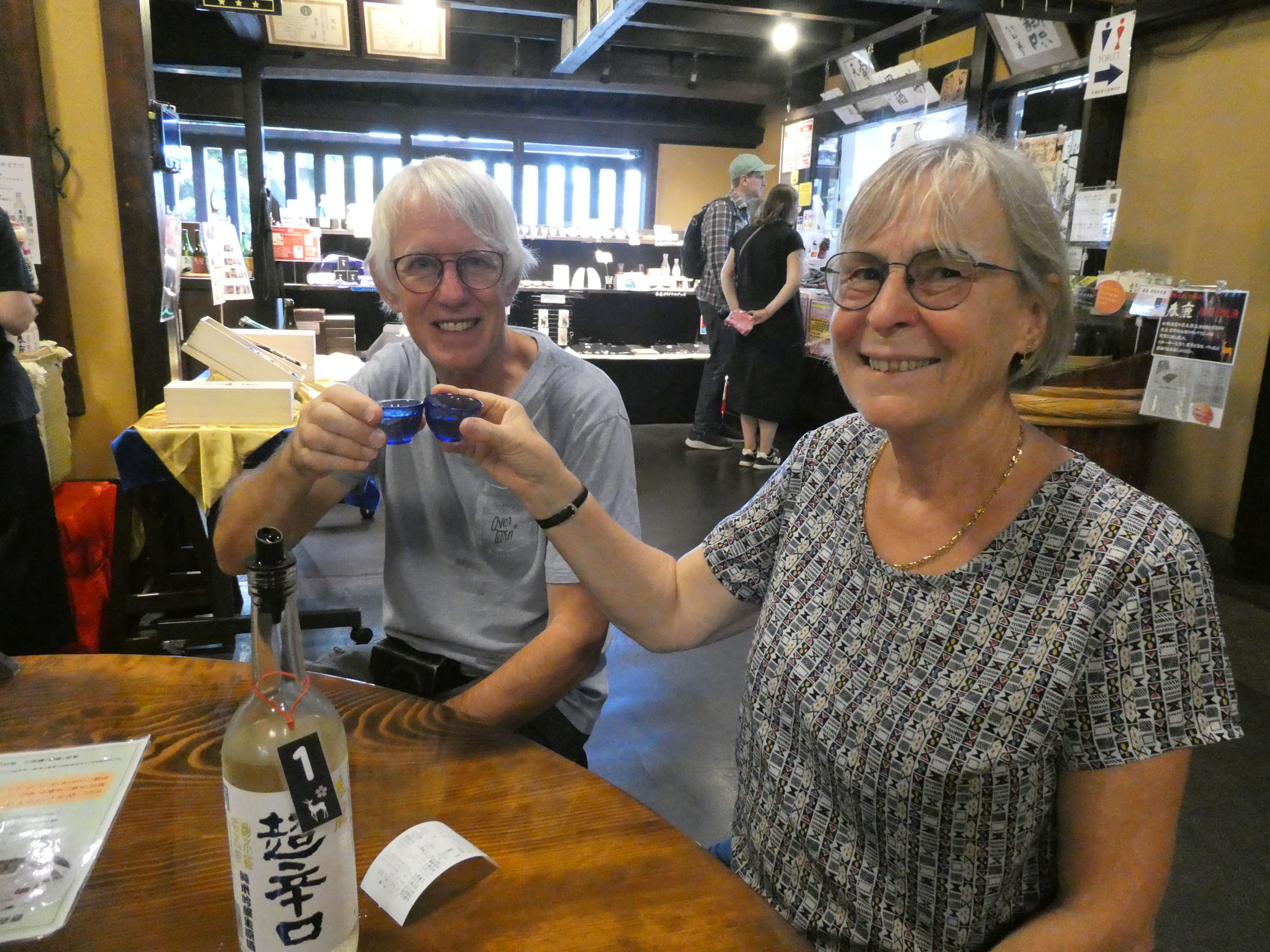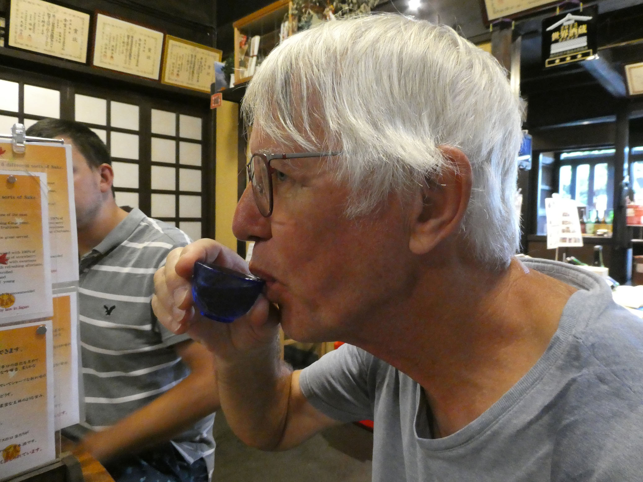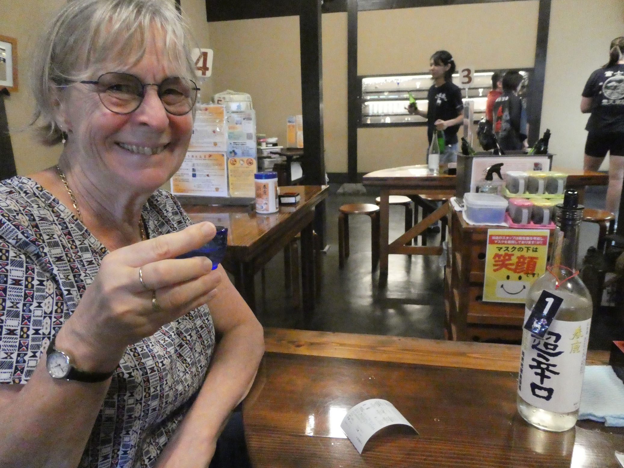 On continue par une dégustation de sake à la Harushika Sake Brewery. Cinq sortes de sake, dont un pétillant. Sur les photos, on n’en est qu’à la première. Très bon, rien à voir avec ce qu’on sert dans certains restaurants asiatiques en France.