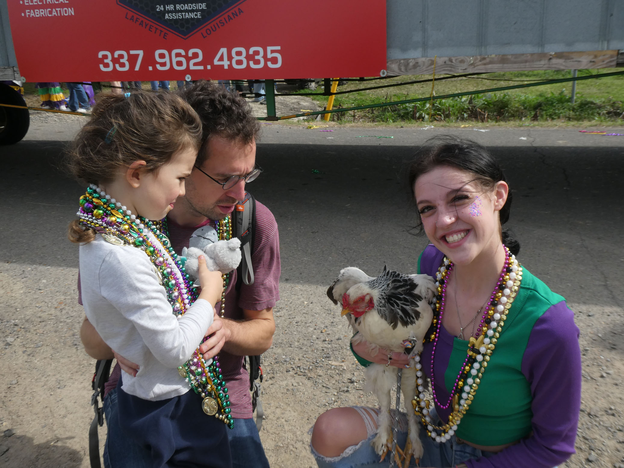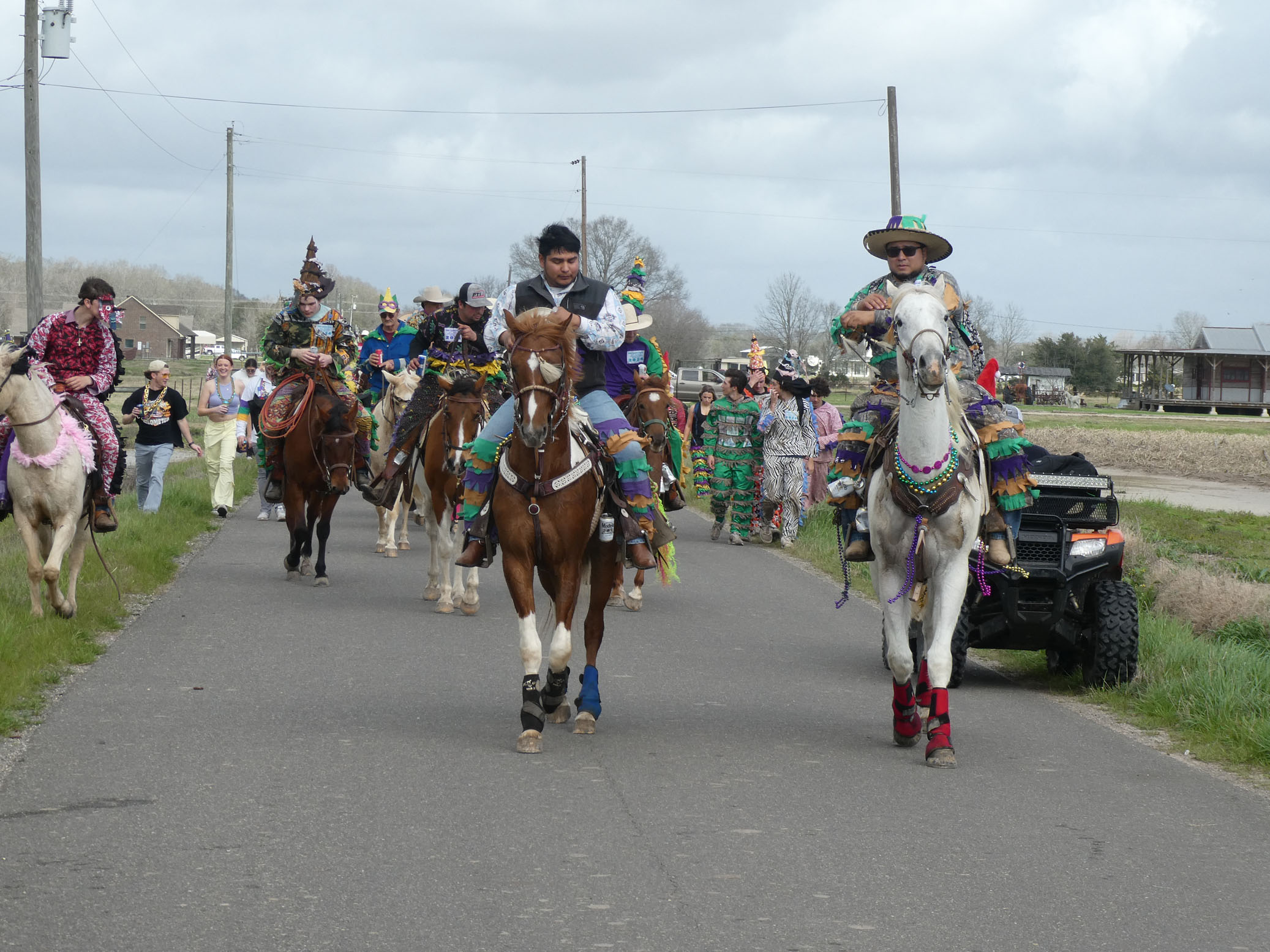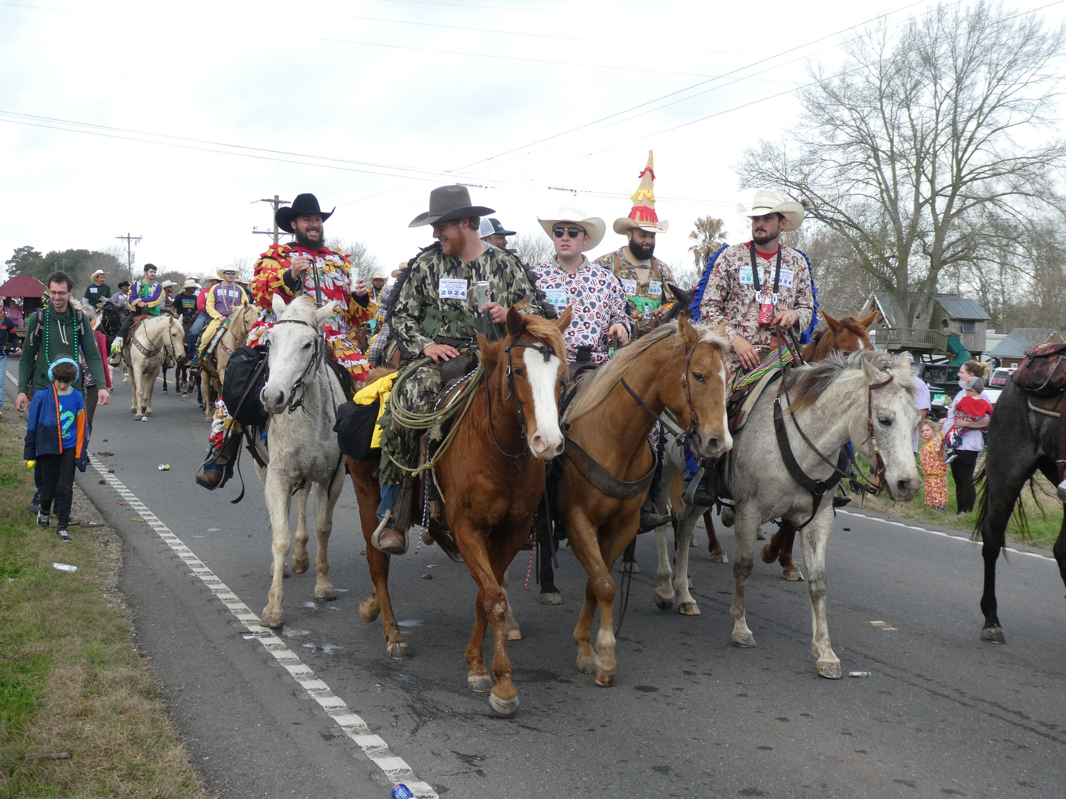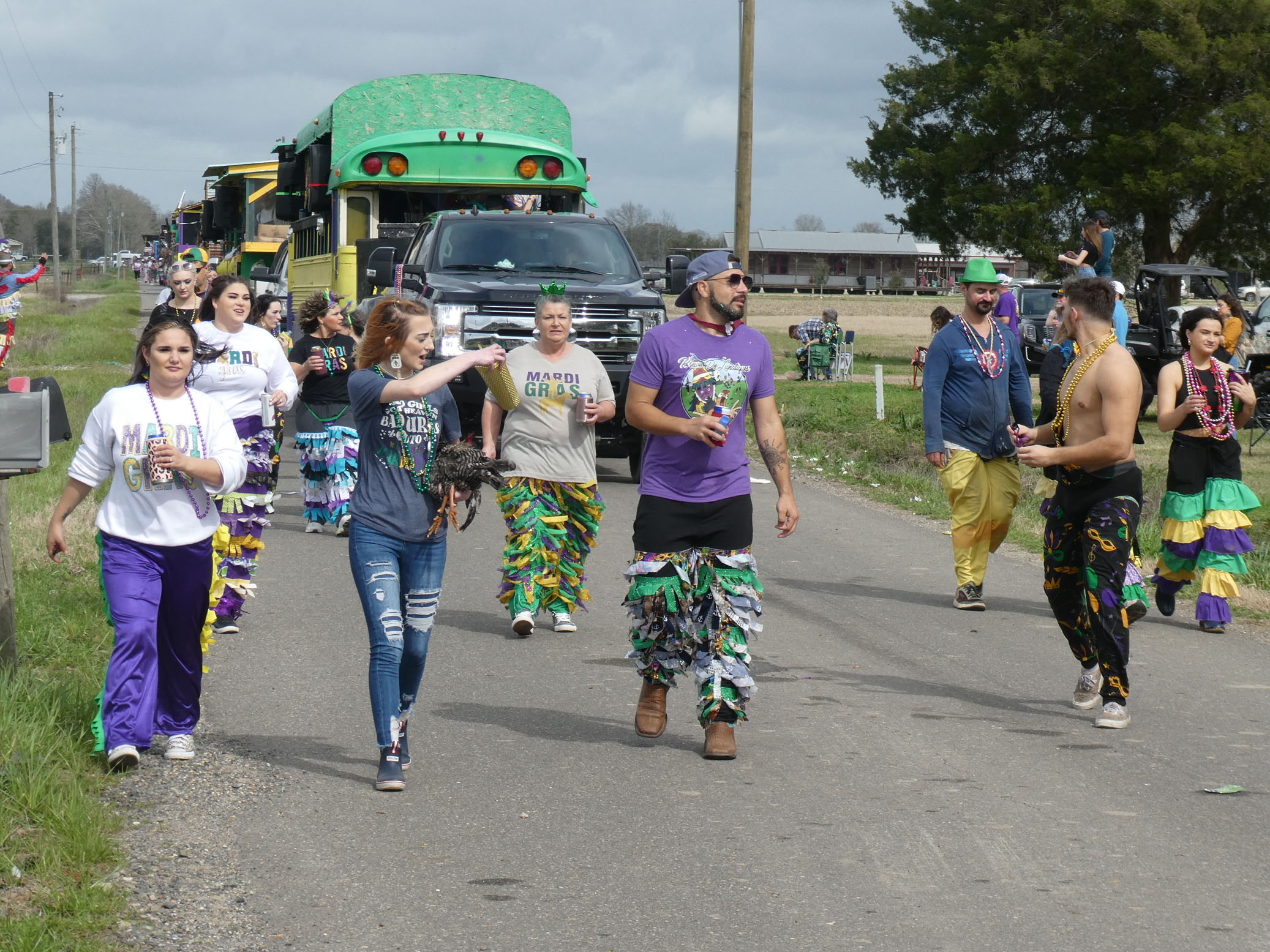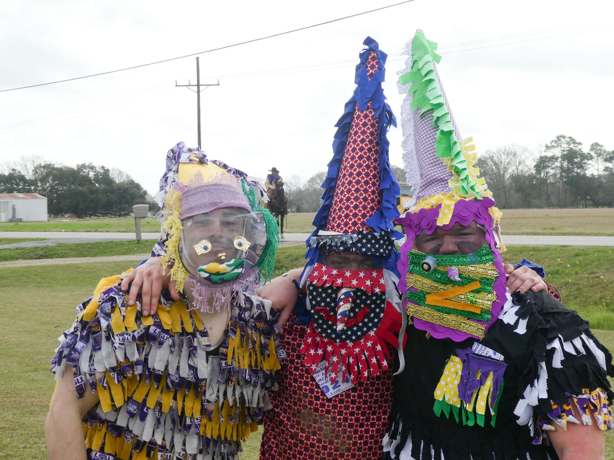 Aujourd’hui nous avons vu l’Amérique profonde. Nous sommes allés à Church Point (Pointe à l’Église), dans la campagne près de Lafayette, pour suivre un « Courir de Mardi Gras ». Des chevaux, des déguisements, des poules qu’on jette et que les gens doivent attraper, une parade, des colliers jetés dans la foule, de la musique … et beaucoup de bière. Trump semble y avoir une bonne réserve d’électeurs.