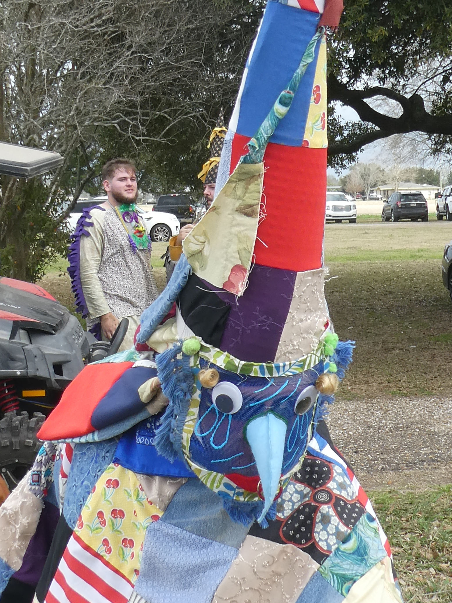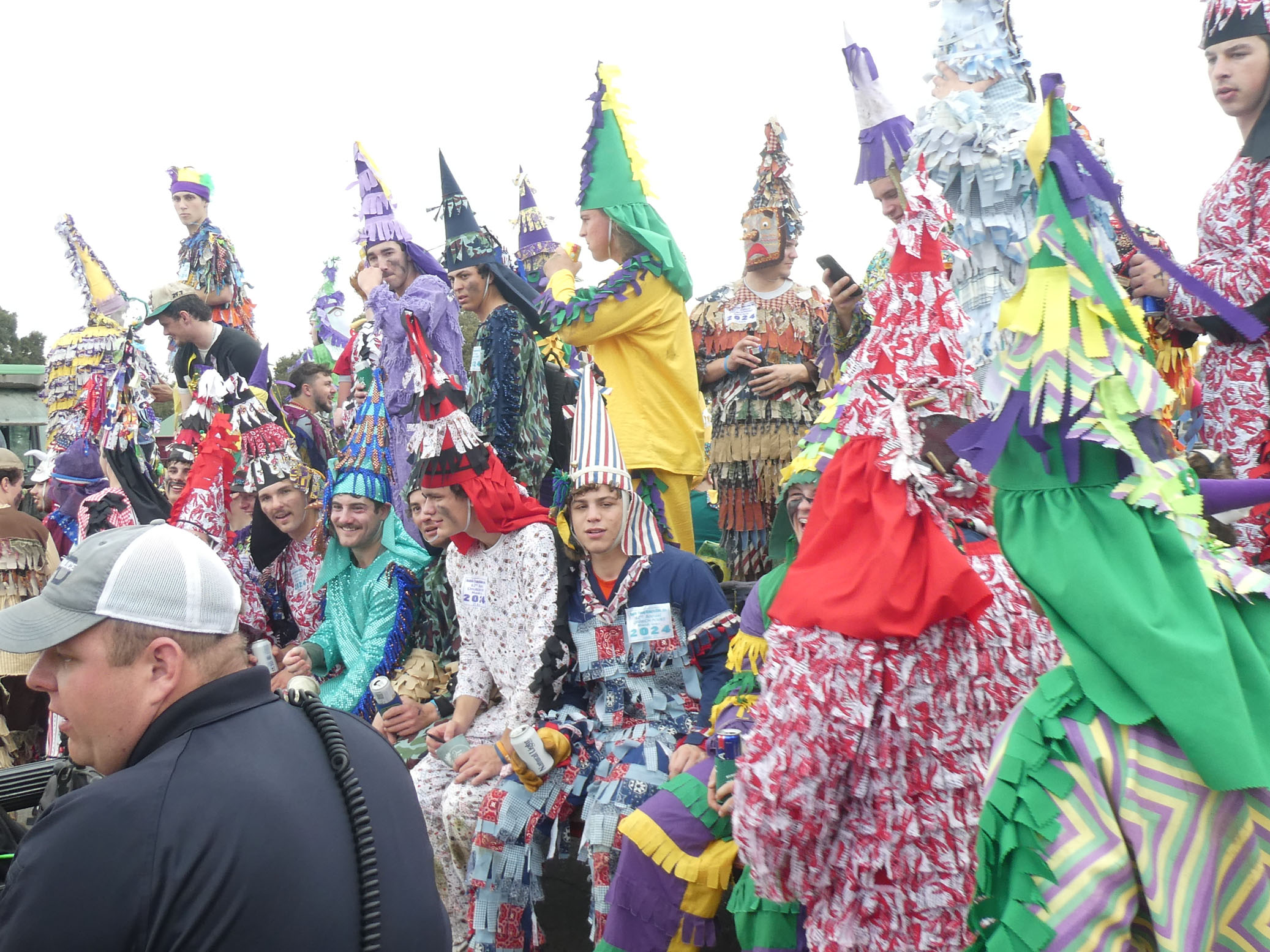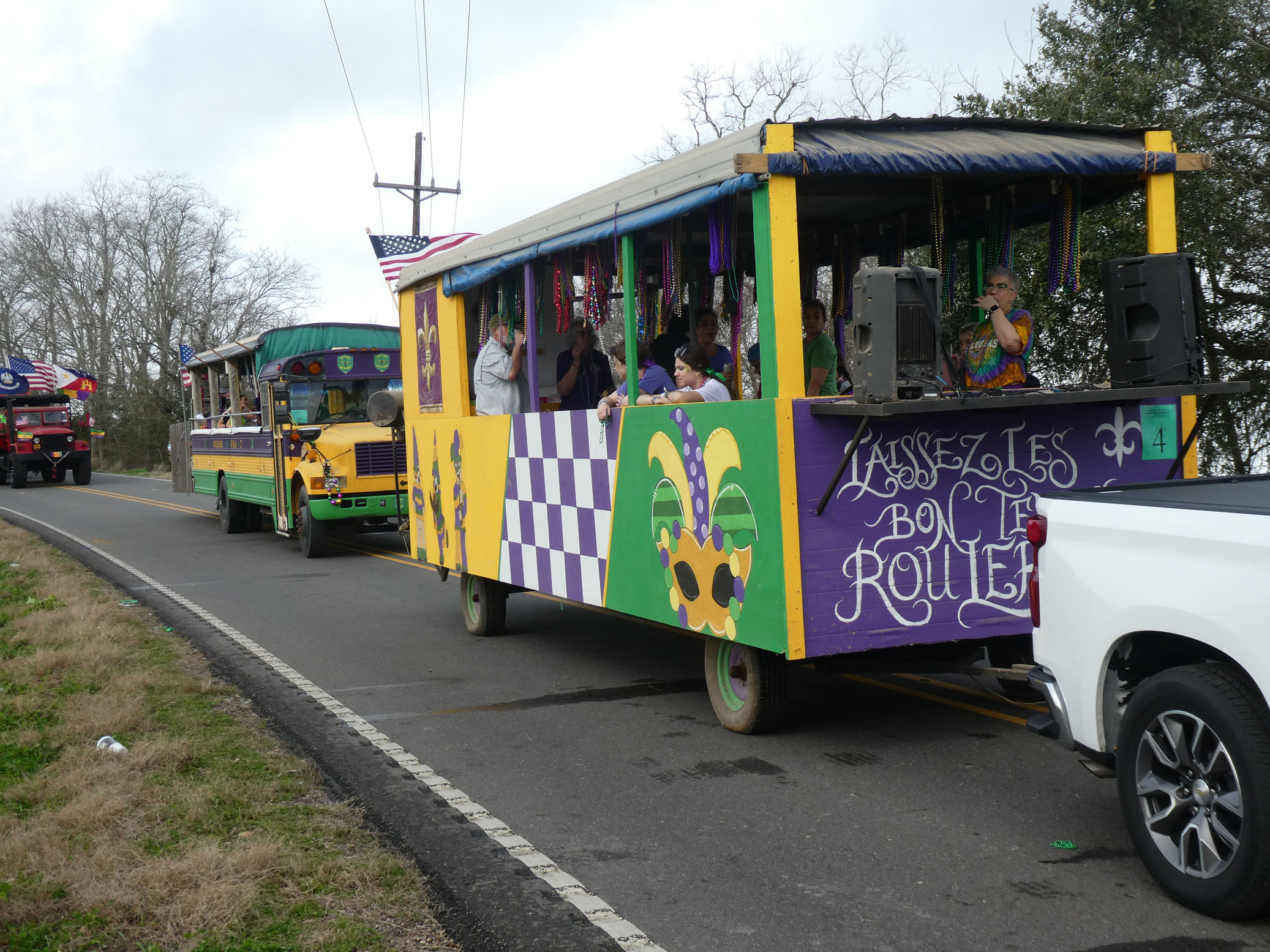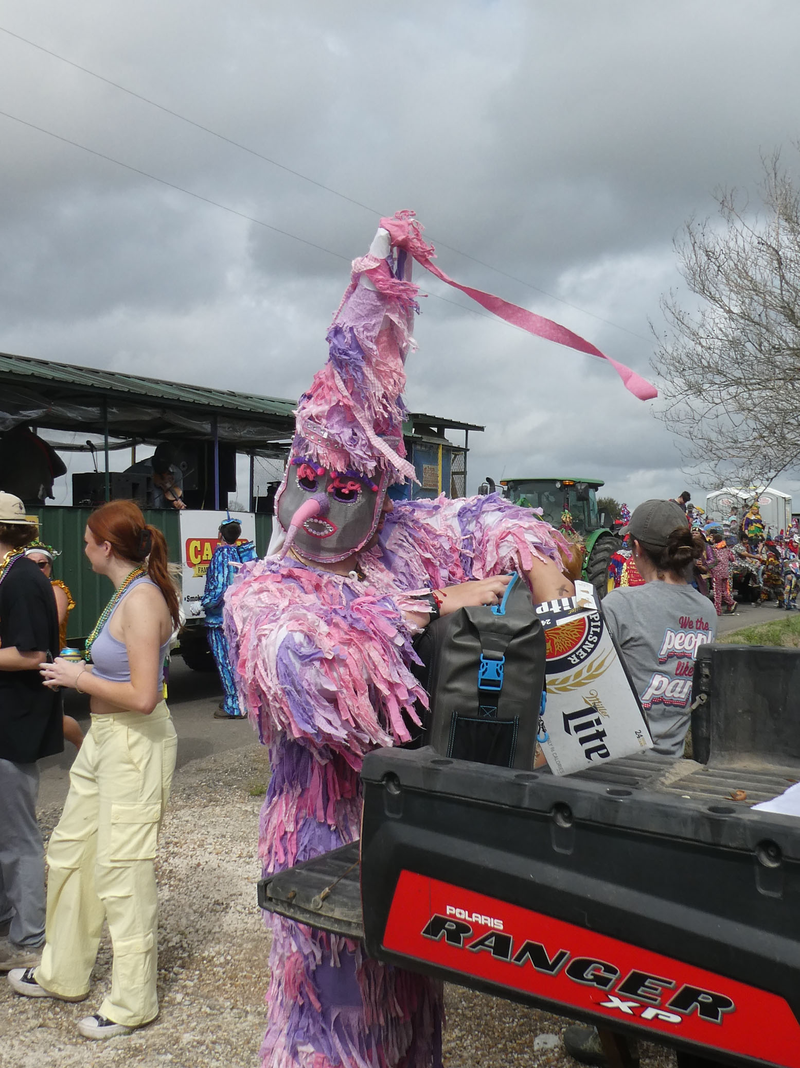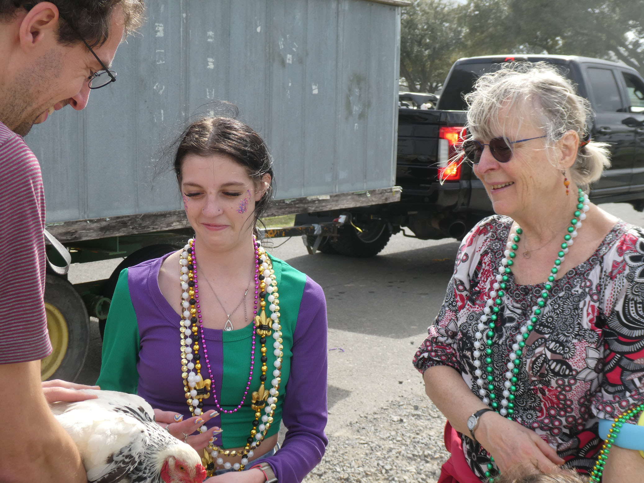Aujourd’hui nous avons vu l’Amérique profonde. Nous sommes allés à Church Point (Pointe à l’Église), dans la campagne près de Lafayette, pour suivre un « Courir de Mardi Gras ». Des chevaux, des déguisements, des poules qu’on jette et que les gens doivent attraper, une parade, des colliers jetés dans la foule, de la musique … et beaucoup de bière. Trump semble y avoir une bonne réserve d’électeurs.